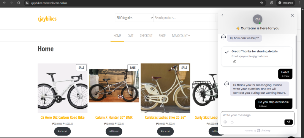Screenshot of the functioning Chatbot on the website’s frontend and the Chatway configuration page.