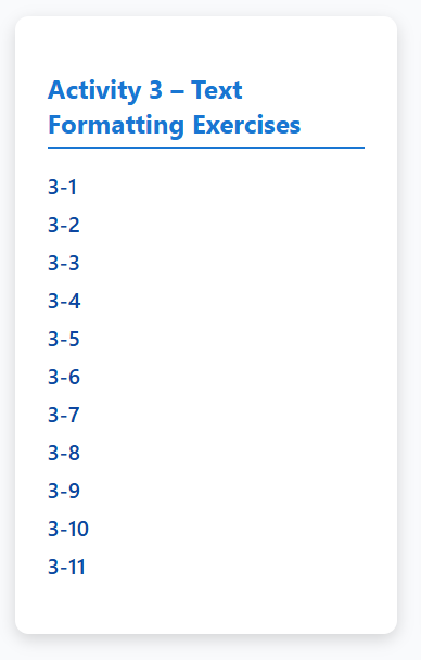 In this activity, I learned how to format text using HTML tags such as headings, bold, italics, and paragraphs. This helped me understand how to make content clearer and more organized on a webpage.