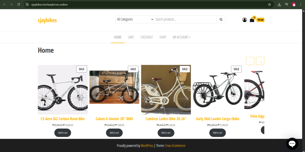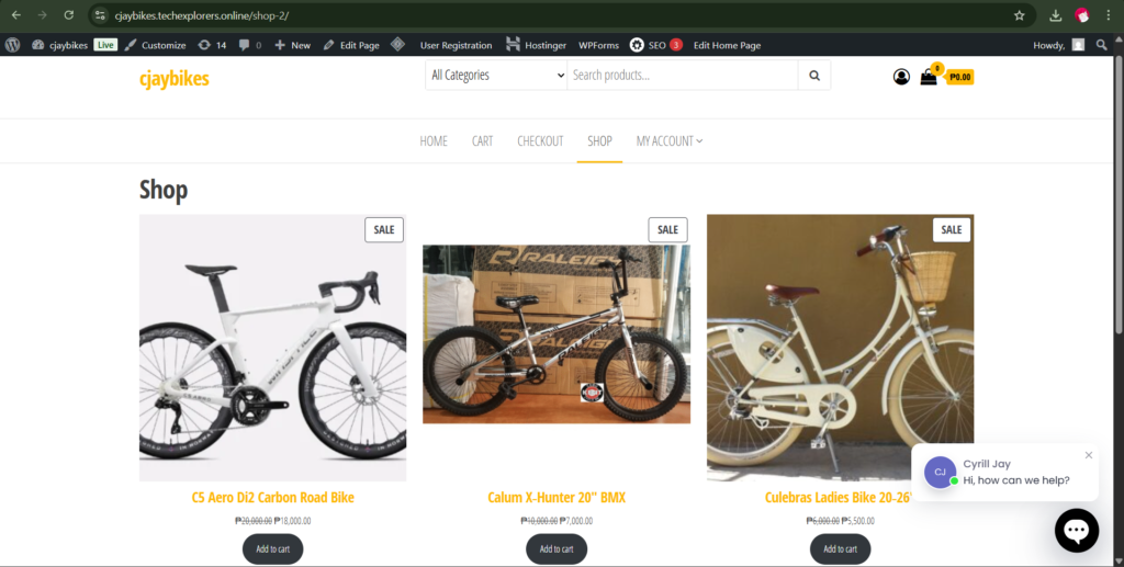 Screenshots of the configured Shop Page, a Product Page, and the backend E-commerce settings.